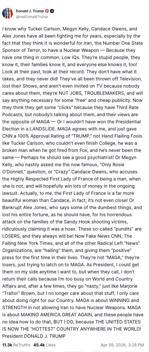 In a recent, characteristically lengthy Truth Social post, the former president took aim at a specific group of ex-MAGA influencers and podcasters who have turned critical of him. The list of targets included major names like Tucker Carlson, Megyn Kelly, Candace Owens, and Alex Jones. Trump didn’t hold back, labeling the group “stupid people, nutjobs, and troublemakers” in a scathing public rebuke.