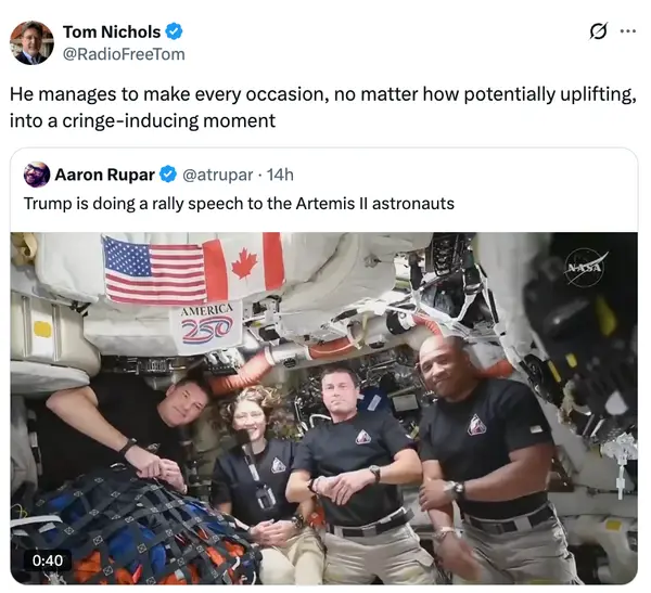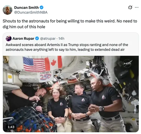 Awkward scenes aboard Artemis II as Trump stops ranting and none of the astronauts have anything left to say to him, leading to extended dead air pic.twitter.com/4PjfPhfgY8