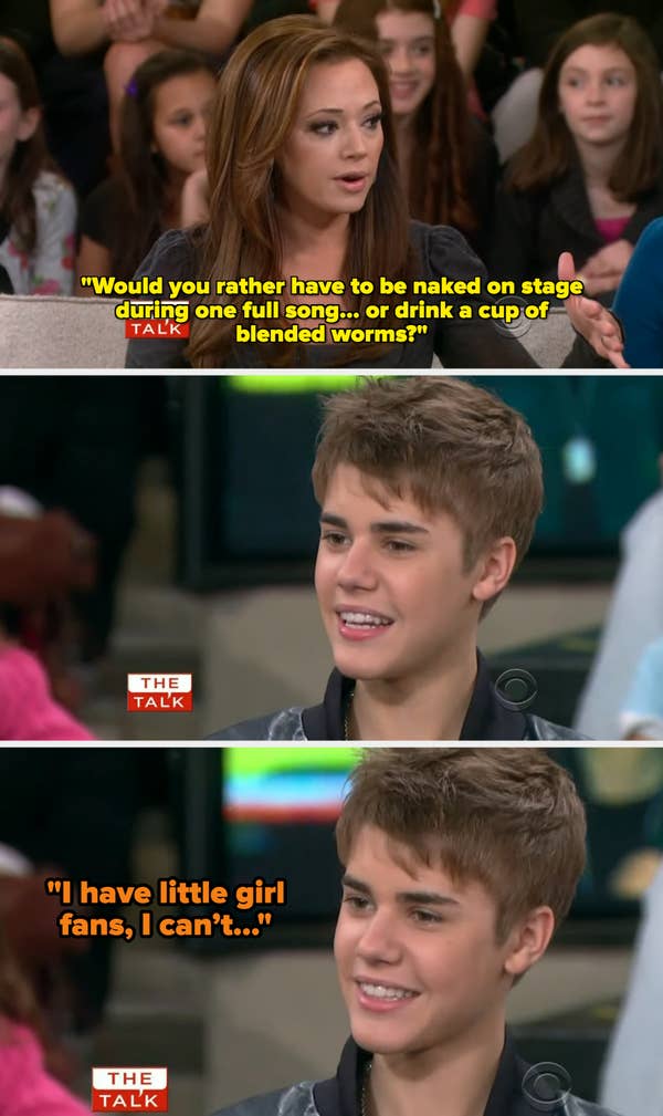 That same year, Justin faced a cringeworthy interview on The Talk. Host Leah Remini asked the teenager if he would rather be “naked on stage” or “drink a cup of blended worms.” Justin shut it down instantly, citing his young female fanbase as the reason he couldn’t do such a thing.
