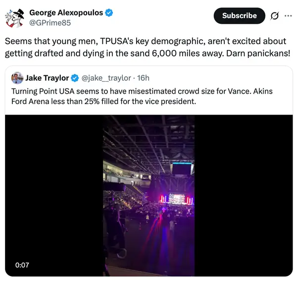 6. “Seems that young men, TPUSA’s key demographic, aren’t excited about getting drafted and dying in the sand 6,000 miles away. Darn panickans!”