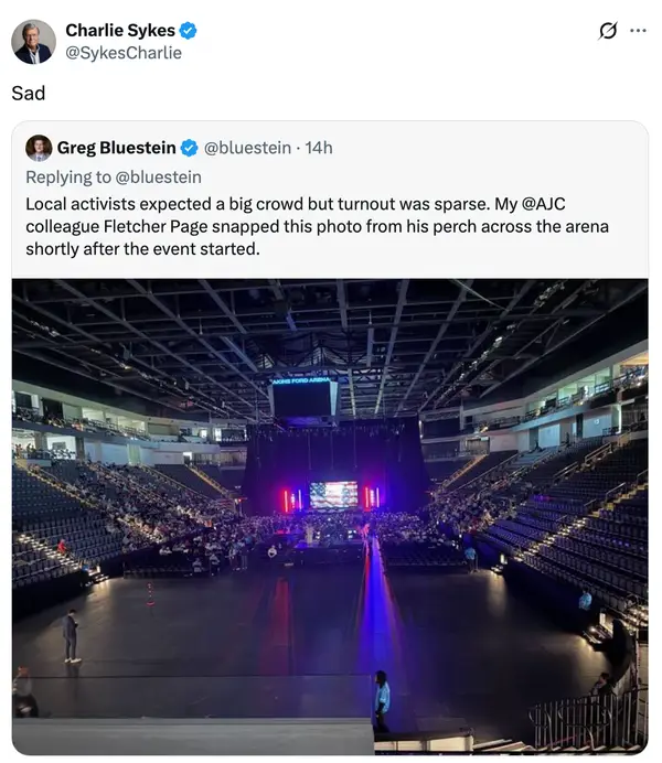 Jake Traylor, a reporter for NBC News, shared a video clip displaying rows upon rows of vacant chairs. By his estimation, the venue reached a meager 25% capacity: