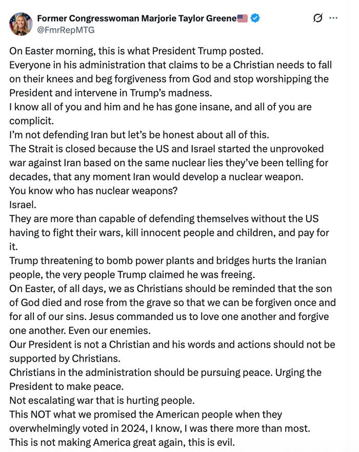 “On Easter morning, this is what President Trump posted,” she began in an X post alongside a screenshot of Trump’s scathing Truth Social Post. “Everyone in his administration that claims to be a Christian needs to fall on their knees and beg forgiveness from God and stop worshipping the President and intervene in Trump’s madness.”