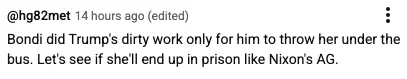 “Bondi did Trump’s dirty work only for him to throw her under the bus. Let’s see if she’ll end up in prison like Nixon’s AG.”
