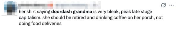 “Her shirt saying ‘DoorDash Grandma’ is incredibly bleak—peak late-stage capitalism. She should be relaxing on a porch with coffee, not running food deliveries,” another person observed.