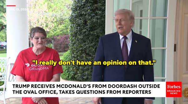 Even though the delivery was technically complete, Trump wasn’t ready to let the DoorDash Grandma leave just yet. He invited her to stand beside him while he took questions from the gathered press corps.